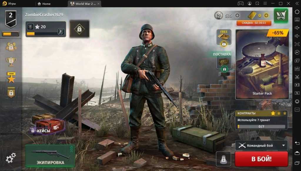В меню вы можете менять экипировку своего героя и прокачивать оружие. Также доступно изменение самого героя. Есть солдаты из разных армий: американской, японской, немецкой и, конечно же, советской. Вы можете выбрать любого из них — или оставить установленного по умолчанию — и отправиться в свой первый бой.