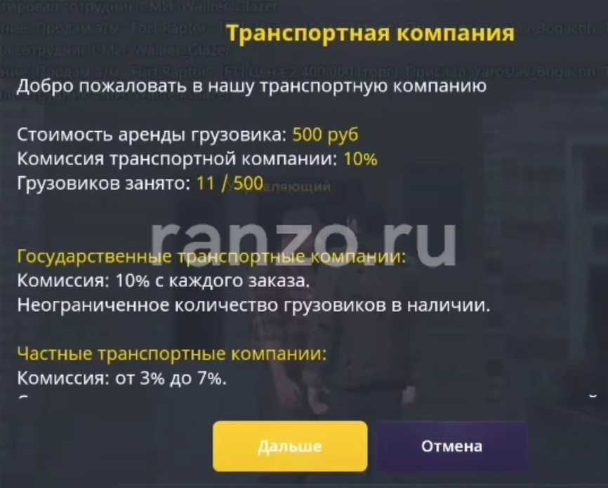 Данная работа доступна начиная с 5-го уровня. Трудоустройство возможно в разные транспортные компании. Вы можете выбрать любую из предложенных: ТК ГрузоКоннект, ТК ВекторГруз, ТК Транс Груз Лис, ТК Государственная №1, ТК Государственная №2. Две компании государственные, а три остальные — частные (т.е. принадлежат других игрокам). Стоит отметить, что условия работы будут отличаться.