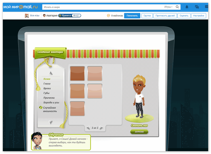 Если вы девушка, то обязательно настройте цвет кожи, форму глаз и бровей, их цвет, поправьте губы и установите похожую прическу, а если вы парень – не забудьте выбрать усы и бороду. Список причесок занимает несколько страниц, чтобы перейти далее, необходимо нажать на зеленую стрелку.