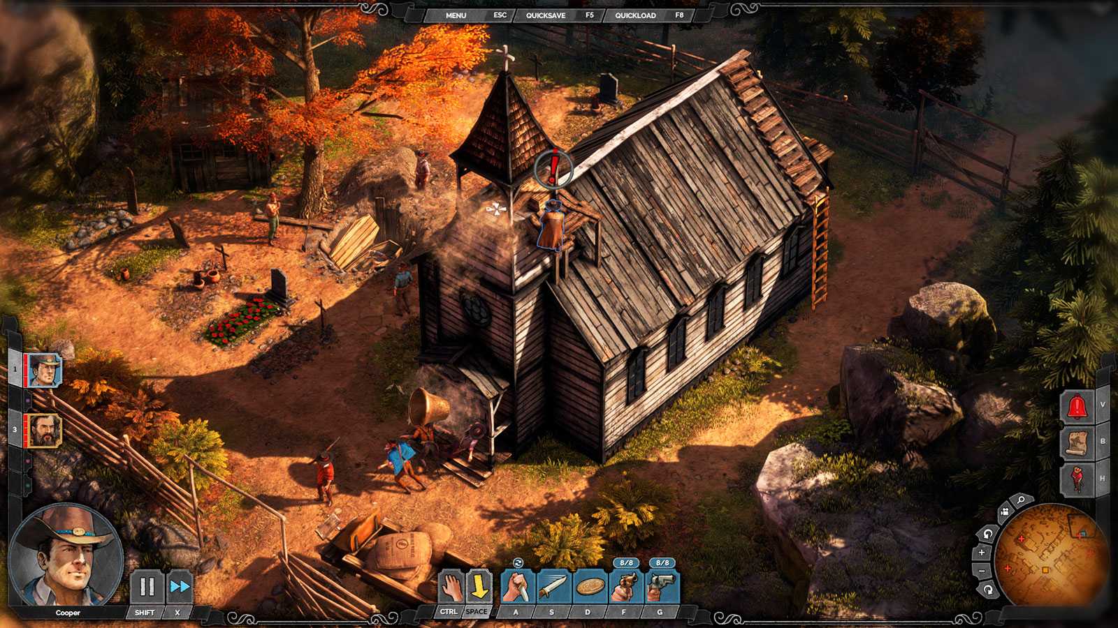 На первый взгляд это не очевидно, но в Shadow Tactics полностью трехмерное окружение со свободным вращением камеры, благодаря чему уровни более сложные. Игра намекает на необходимость чаще сохраняться – здесь даже есть таймер, отсчитывающий время с момента последнего быстрого сохранения – и это очень полезно. Shadow Tactics была настолько хороша, что именно ее разработчик, Mimimi Productions, был выбран для создания Desperados 3.