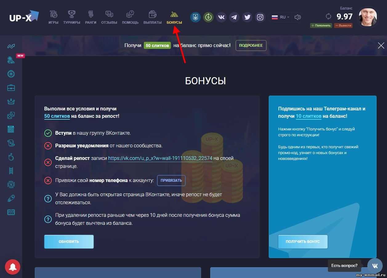 Администрация UP X щедро вознаграждает своих пользователей. Тут раздается куча халявы, как для новых, так и для опытных игроков. Когда вы авторизуетесь впервые на сайте, на балансе уже будет 5 слитков, внутренняя валюта эквивалента рублю. Отправляйтесь в раздел Бонусы и собирайте остальные подарки: