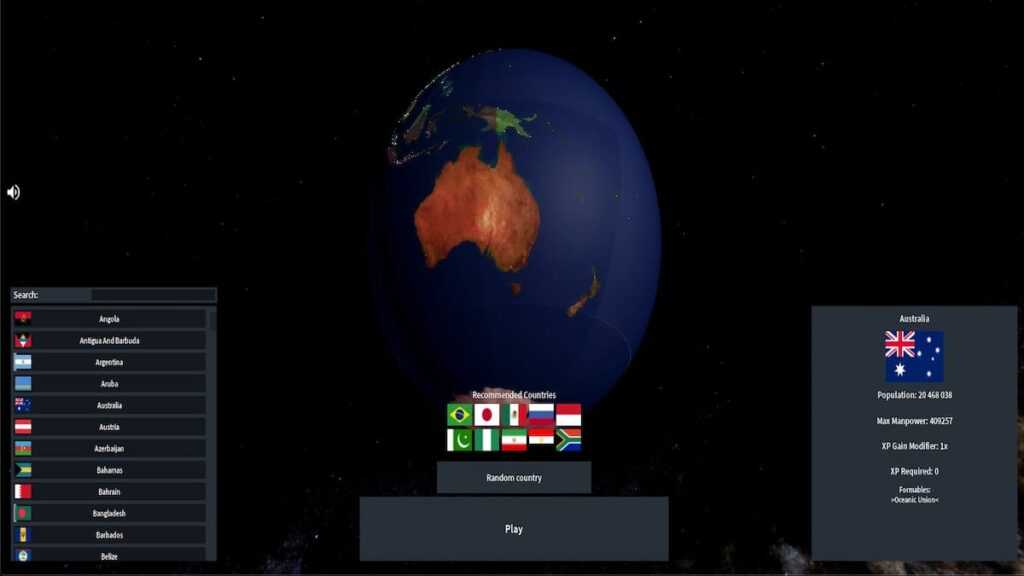 Чтобы начать свое восхождение к славе, вы должны выбрать нацию вести. Когда вы присоединяетесь к серверу, слева будет список стран, а посередине — несколько рекомендуемых стран. Когда вы нажмете на каждый из них, он покажет вам его статистика на правой стороне. Здесь вы найдете численность населения, рекрутов, модификаторы опыта и любые возможные союзы, доступные в будущем. В зависимости от размера сервера некоторые страны могут быть недоступны для выбора, если другие уже заявили на них права. В некоторых странах также требуется определенный уровень XP для лидерства. Начать стоит с любой страны, но вы захотите найти здоровый баланс рабочая сила, Населениеа также потенциальные союзы для отличного старта.
