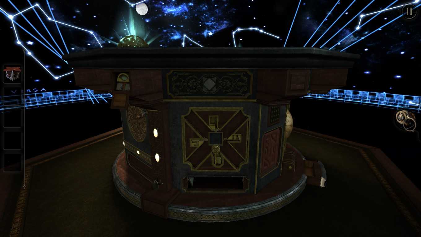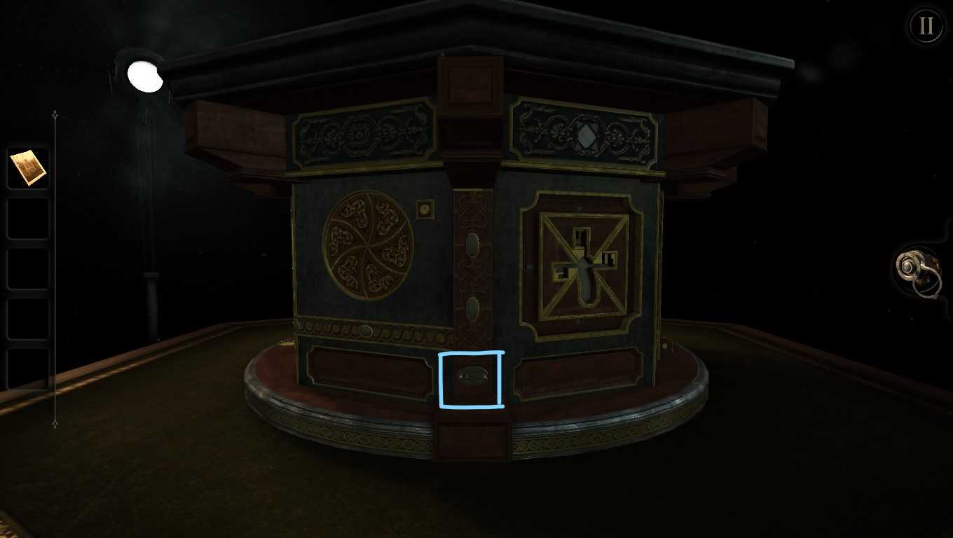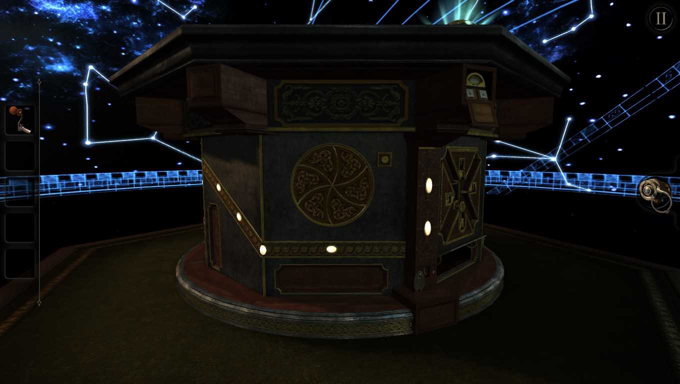 Вытягиваем ящик, забираем устройство для отражения света. Нажимаем на кнопку в днище ящика, забираем часть карты. Устройство для отражения света вставляем в отверстие вверху луча. Автоматом приближаемся к устройству с кнопками. Нажимаем на кнопку слева. Крутим шкатулку влево. Нажимая на своём пути на кнопки. Из открывшегося отделения забираем ключ. Возвращаемся к устройству с двумя кнопками, проделываем ту же операцию, только нажимаем на правую кнопку и крутим, соответсвенно, вправо. Из тайника забираем кусок карты.