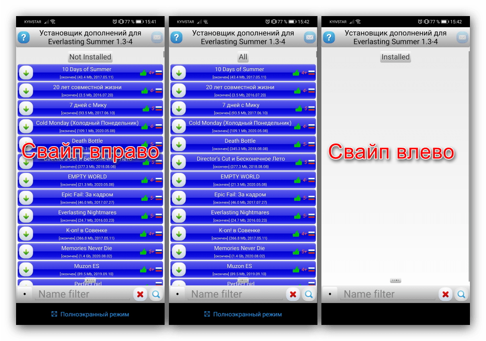 Появится главное меню приложения, в котором по умолчанию отображаются все доступные модификации. По свайпу вправо открываются ещё не установленные, а этот же жест налево открывает инсталлированные.