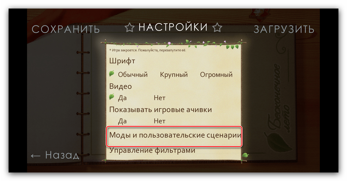 Пролистайте перечень параметров до пункта «Моды и пользовательские сценарии» и нажмите на него.