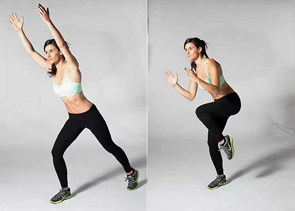 Когда стопа на полу, руки вытянуты вверх. Колено к животу — опустите и отведите назад, чуть сгибая в локтях.