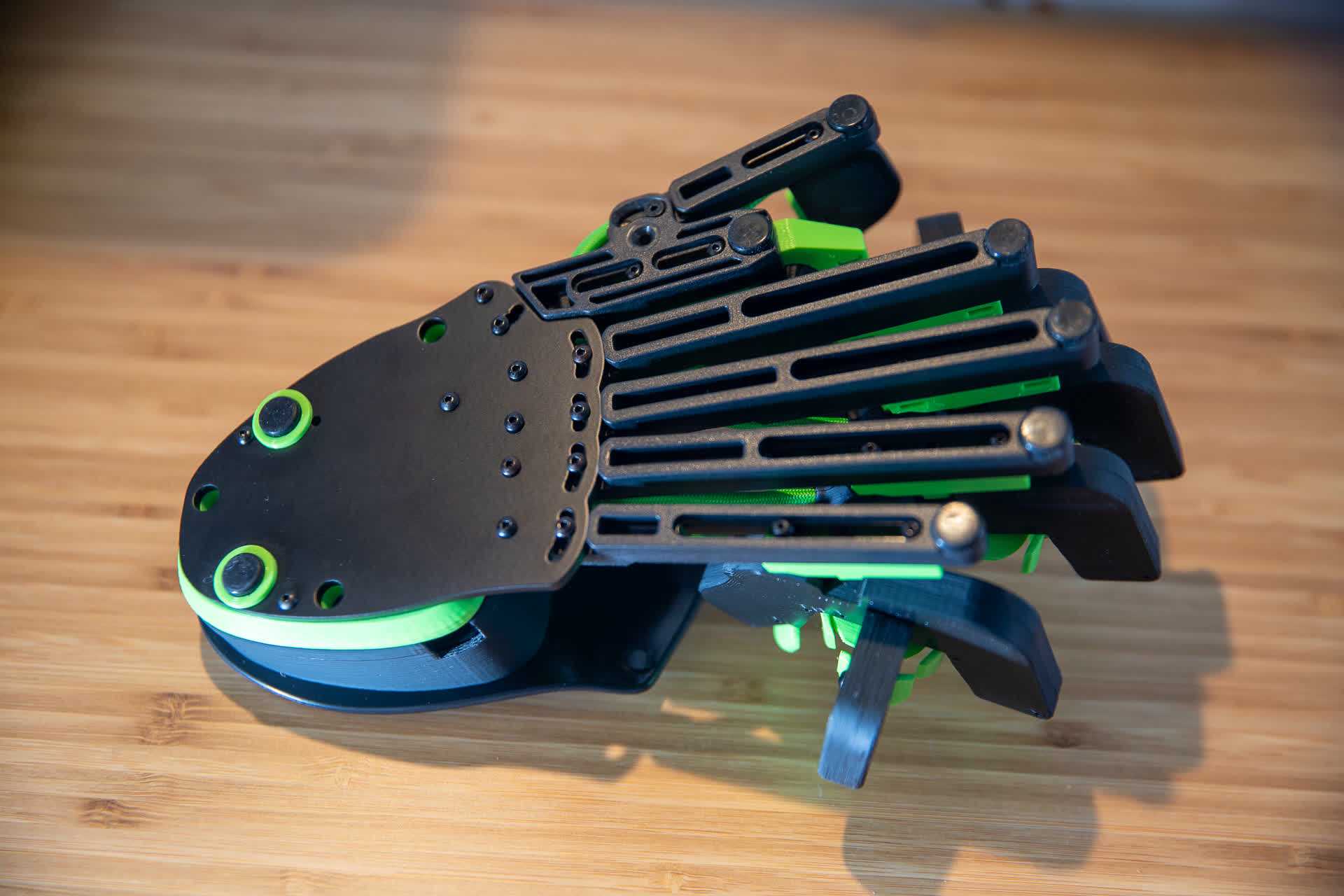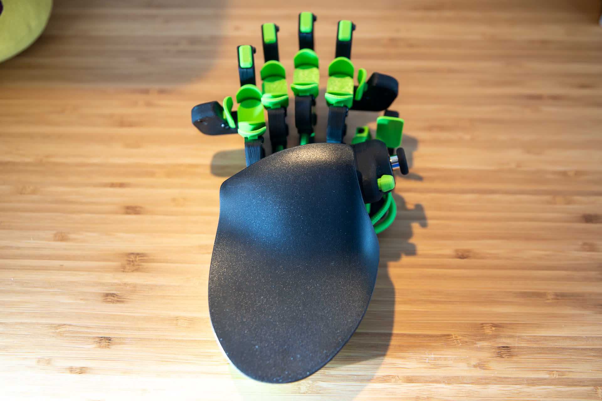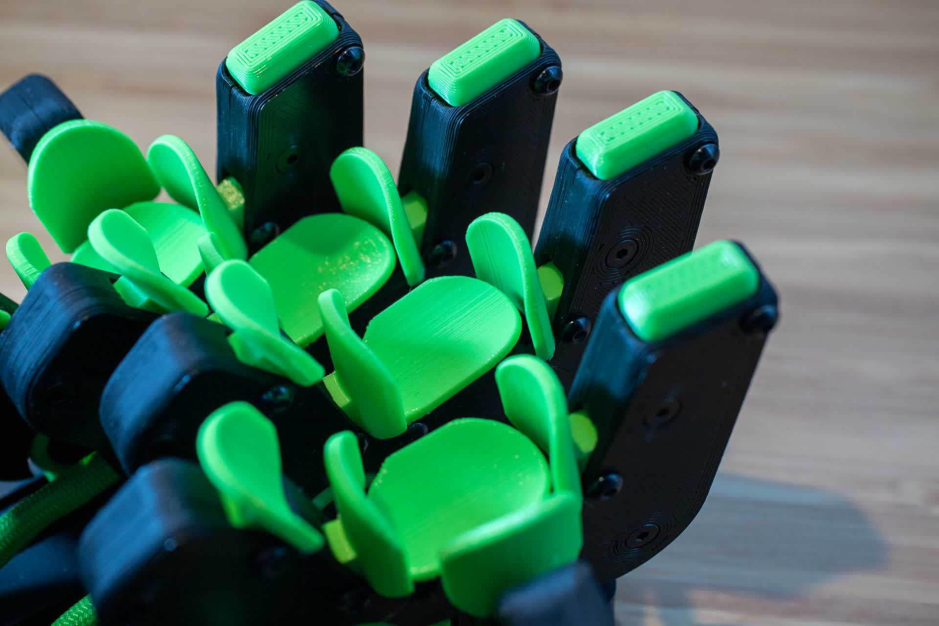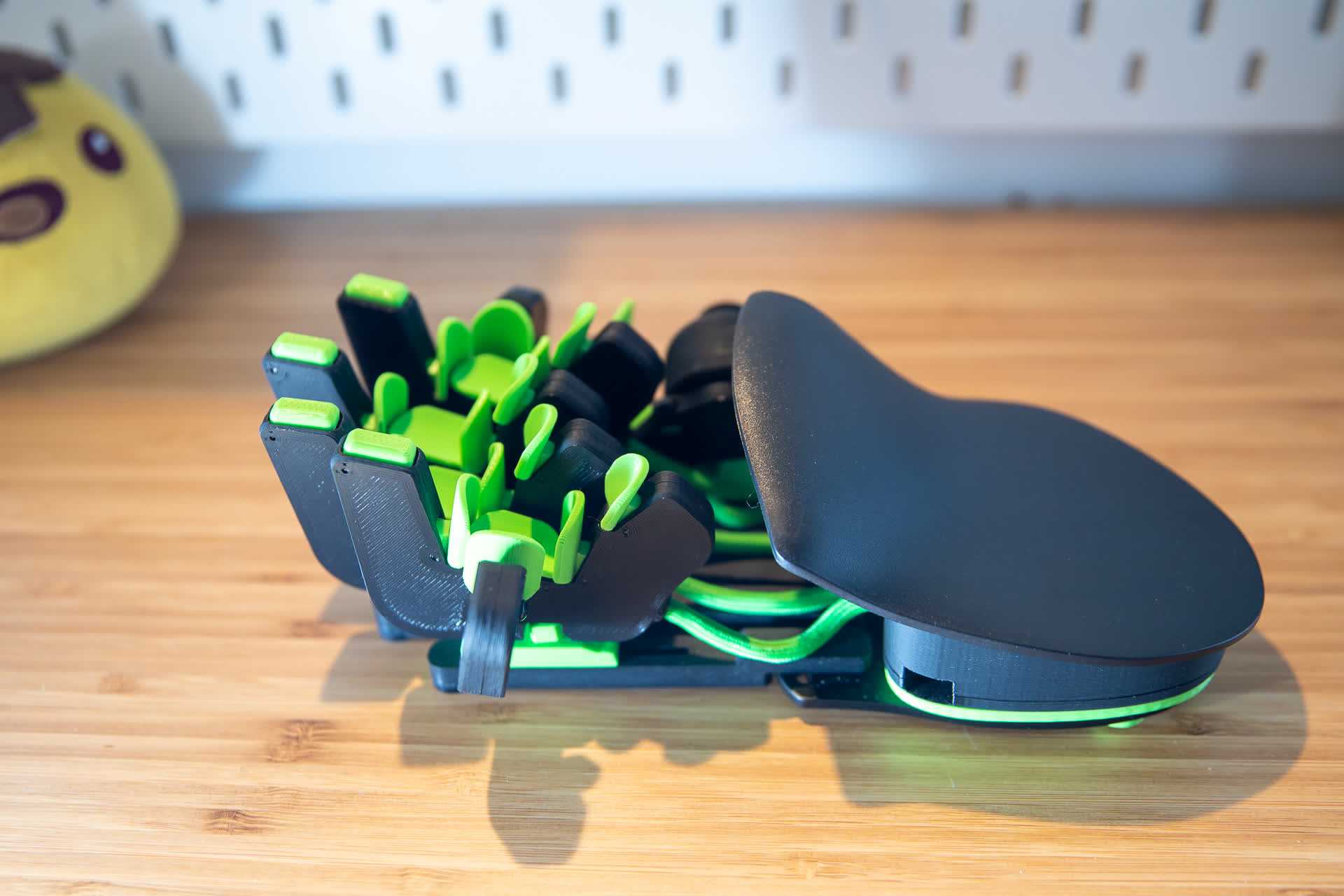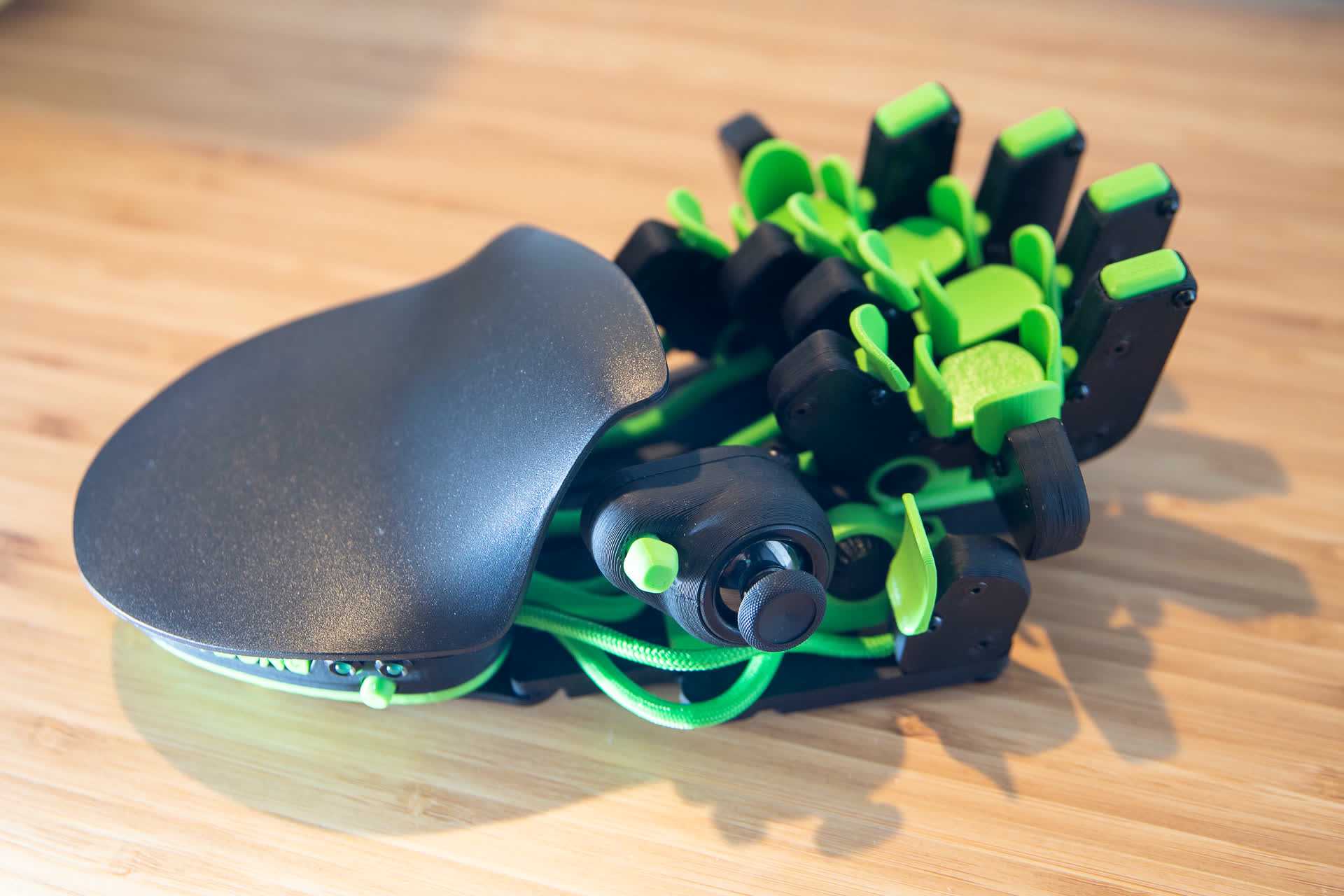 Взлянем поближе на изделие — посмотреть тут есть, на что. Лепестковообразные кнопки напечатаны на 3D-принтере, по четыре на каждый палец, плюс на мизинец и указательные пальцы добавлено по дополнительной боковой кнопке.