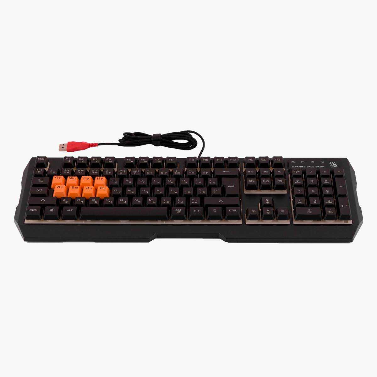 У Bloody B188 104 клавиши. 96 из них мембранные, а остальные восемь — оптические, с ускоренным откликом и более плавным нажатием. Кнопки QWER и ASDF окрашены в оранжевый и примерно на миллиметр выше остальных. Из-за этого печатать не очень удобно — разница в форме кнопок и ощущении от нажатия отвлекает.