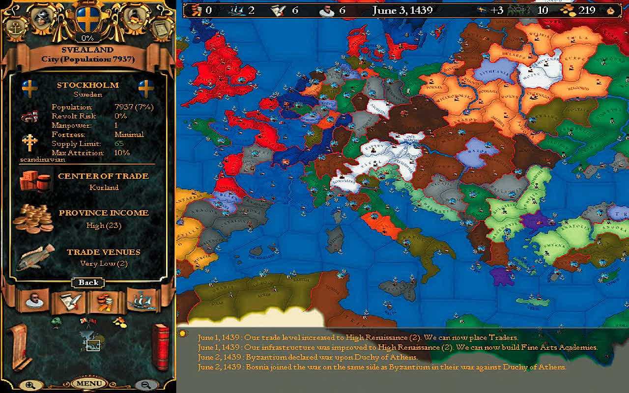 Войны тоже присутствовали, но результаты битв рассчитывались автоматически. Ключевыми факторами победы были сильная экономика, развитые технологии, грамотная дипломатия и своевременные военные действия. Стоит ли играть в первую Europa Universalis в 2020 году? Разве что для ознакомления с истоками серии. Это слишком старая игра, которая не может предложить ничего, кроме ностальгии. Тем более, что новые части на порядок масштабнее и интереснее.