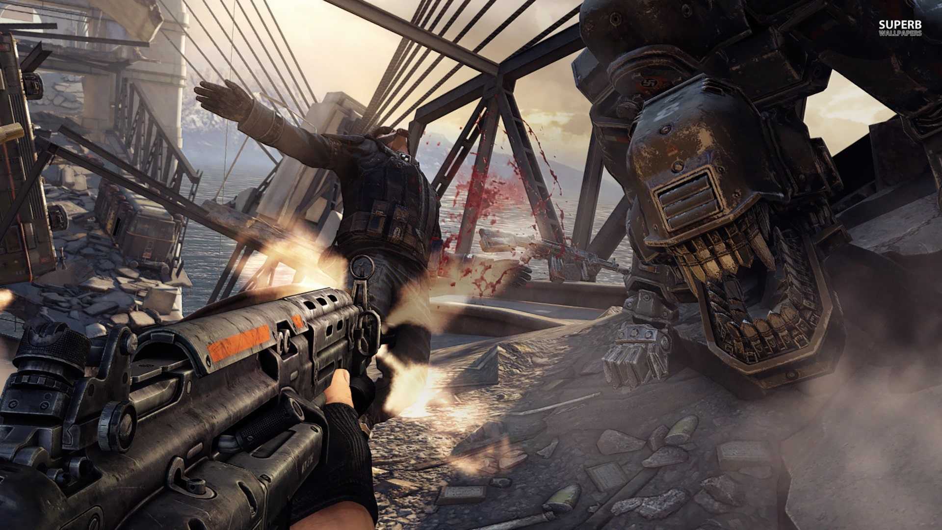 Что ж, задумки и правда были очень смелыми. Во-первых, действие игры перенесли в альтернативную вселенную, где нацисты победили и развернули свою военную машину на полную катушку, создавая мощную робототехнику и захватывая все новые территории. Антиутопический мир игры наполнили жестокостью и sci-fi элементами. Главный герой сам учинял кровавую расправу над нацистскими солдатами и принимал участие в кат-сценах, которые не рекомендуются для просмотра слабонервным игрокам.