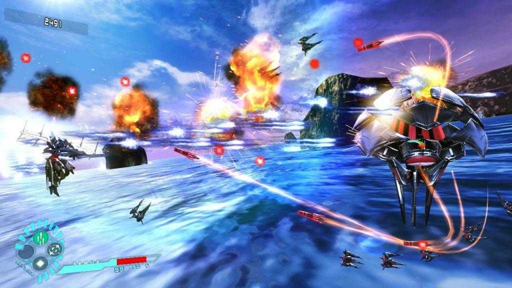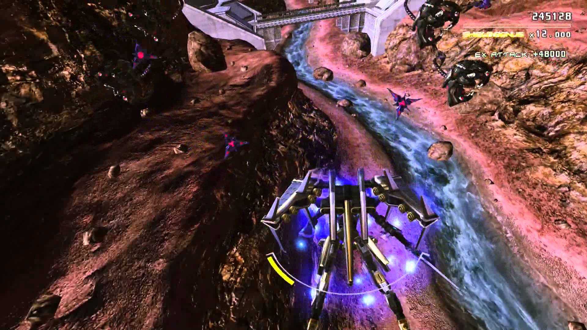 The game is played on three dimensions, horizontal, vertical and cross-axis i.e. 3d. Players can choose 3 types of mecha’s,Astebreed, Xbreed and Leading Sire,each controlled by a different character. The gameplay focuses on three action modes: shooter mode where the mecha shoots lasers; lock on mode, where the mecha locks on to the enemies and fires rockets/missiles, and blade mode, where the mecha uses its blade as a melee weapon to destroy enemies.