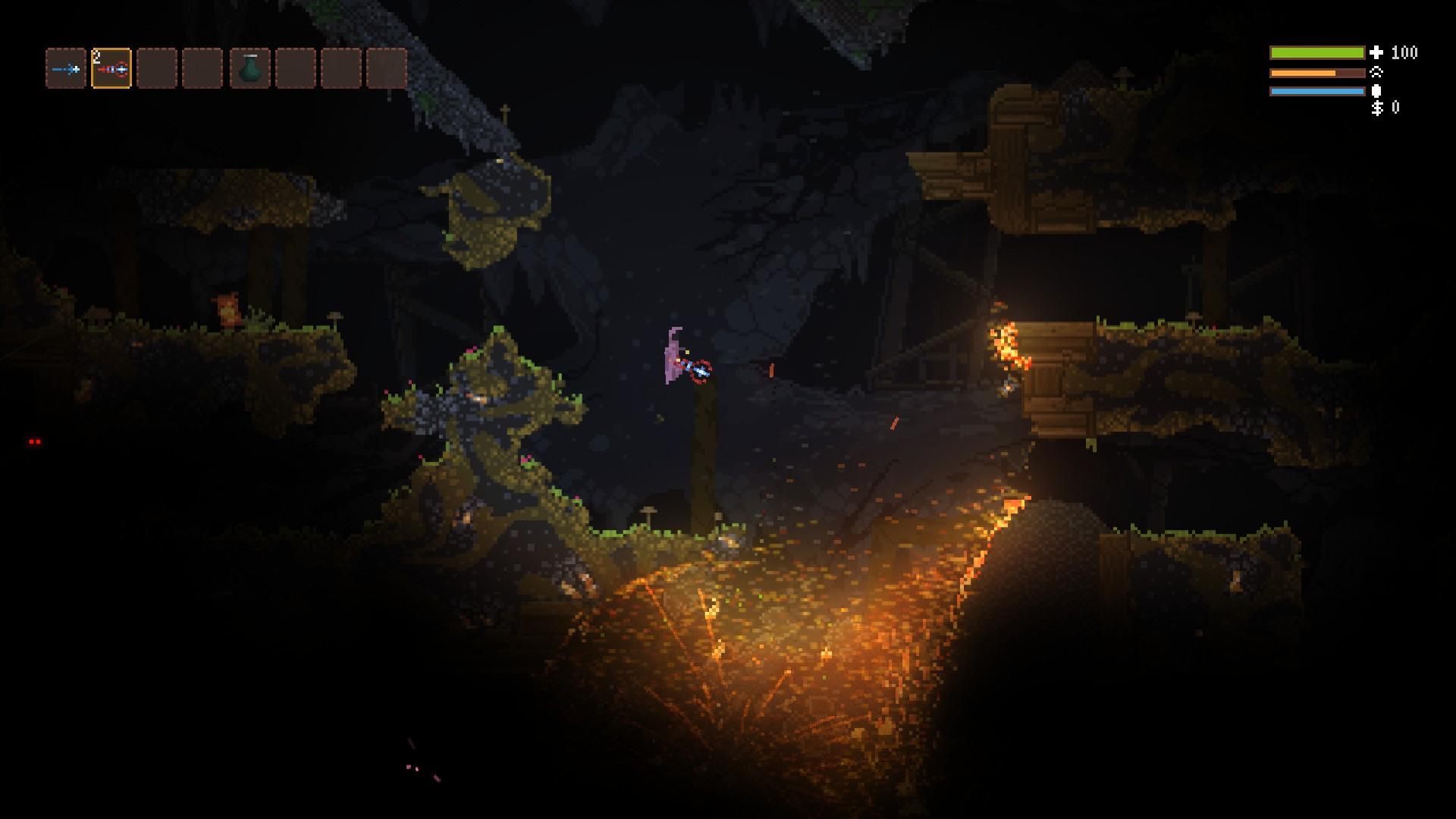 В Noita половина геймплея — это эксперименты с окружением и способностями главной героини. Скриншот: игра Noita / Nolla Games