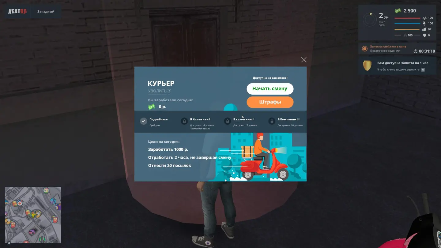 Когда вы достигните 4-го уровня, вы сможете получить такую должность как курьер компании или сотрудник парка. Выбрав первый вариант, вам предстоит доставлять посылки клиентам по указанному адресу. Если же вы отдадите свое предпочтение второму варианту, то вам придется охранять парк, и присматривать за его чистотой. Напомним, что скачать Некст РП ГТА с официального сайта может каждый желающий совершенно бесплатно.