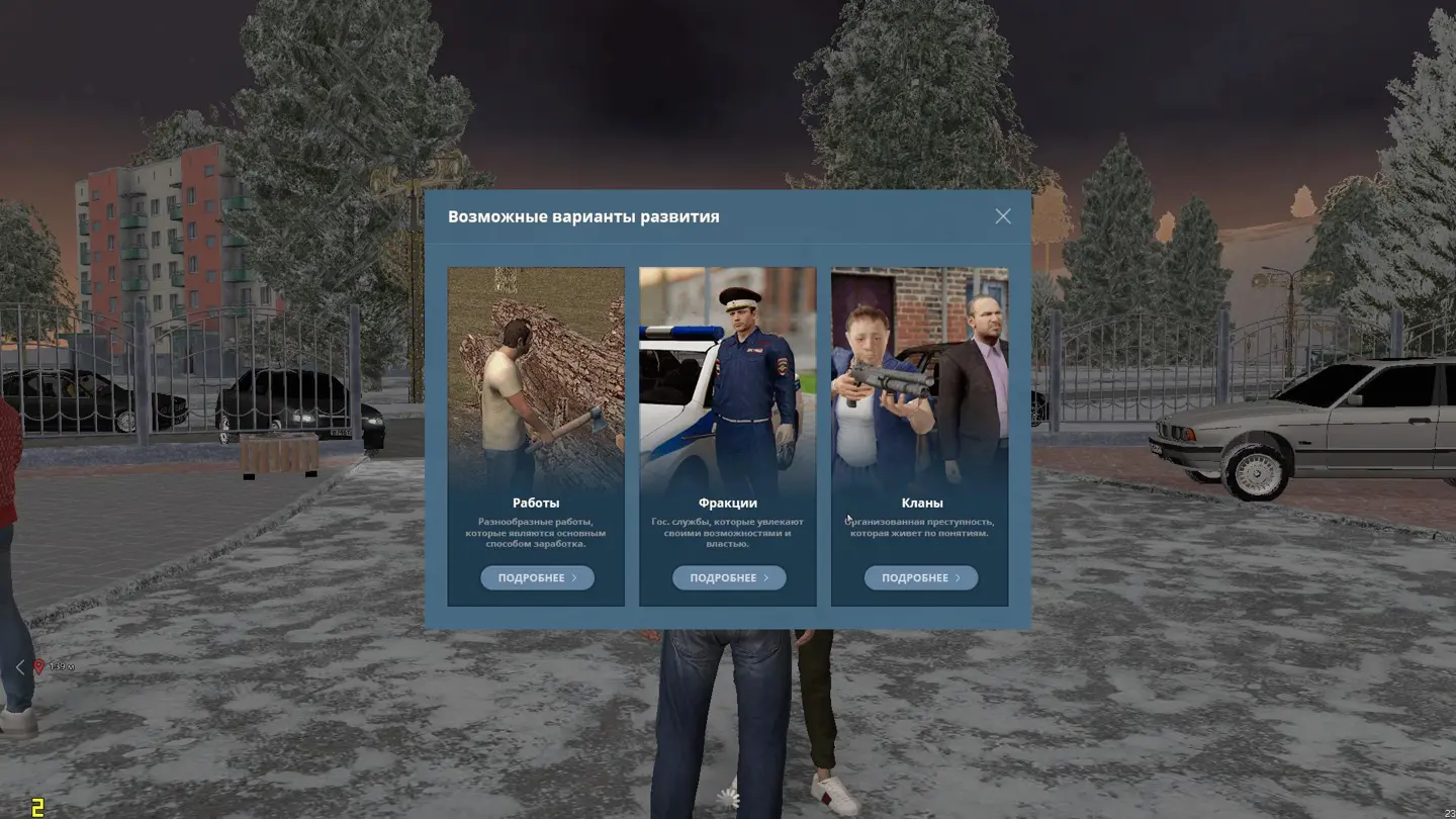 Как и во всех РПГ, зайдя на сервер вы начинаете с персонажем, который абсолютно ничего не умеет, не знает и не ориентируется в этом мире. Вам будет нужно прокачивать его с самого начала, постепенно зарабатывая деньги, обрастая связями и знакомствами. Постепенно вы устроитесь на работу, купите машину, дом и даже обзаведётесь оружием. Конечно, вы не станете сразу главой бандитской группировки, вы должны будете работать грузчиком, таксистом и так далее. Однако, тяжёлая работа окупится, и уже скоро вы сможете подняться по карьерной лестнице. В игре есть огромное количество фракций, группировок, мафиозных семей и прочих возможностей присоединиться к бандитскому миру. Однако, вам необязательно идти по криминальному пути, ведь вы можете встать на сторону закона и работать полицейским. Разбогатеть также можно, открыв свой бизнес, всё зависит только от вас и от вашего трудолюбия. Разнообразие работ здесь просто поражает, поэтому, вы можете не сомневаться, что найдёте тут что-то по душе.