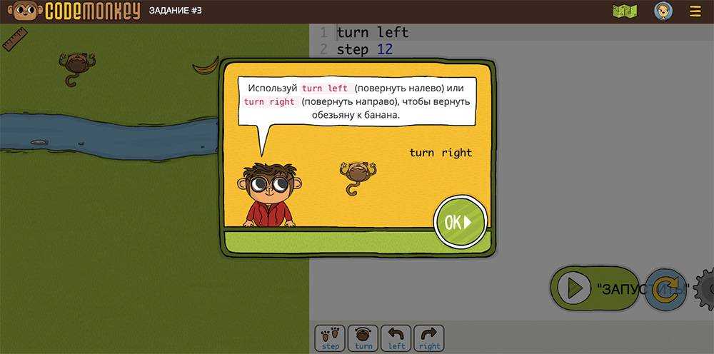 К третьему заданию ребенку уже придется совершить несколько действий: измерить расстояние от обезьяны до банана, исправить число в коде, повернуть обезьяну и нажать на кнопку запуска