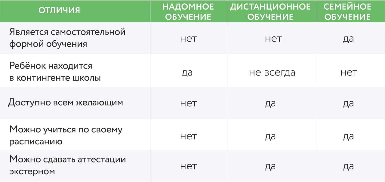 Для большей наглядности продемонстрируем различия трёх видов домашнего обучения с помощью таблицы.