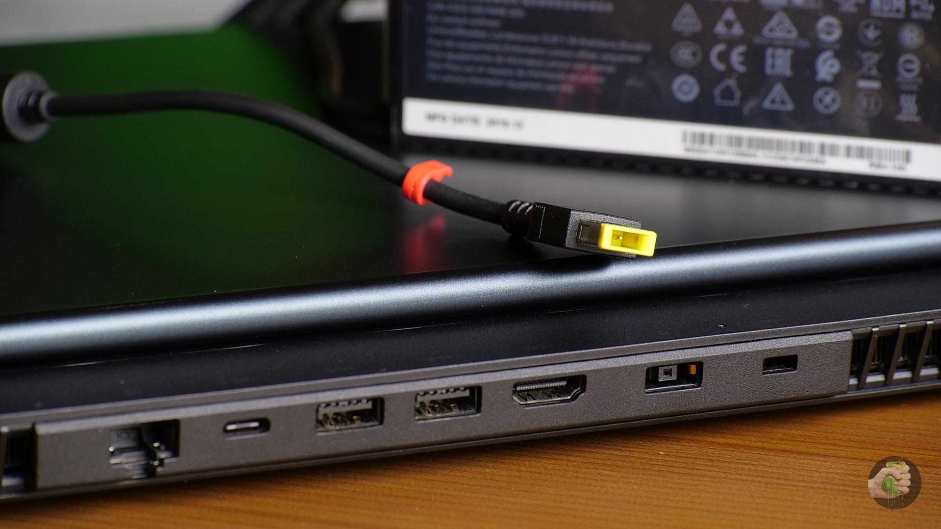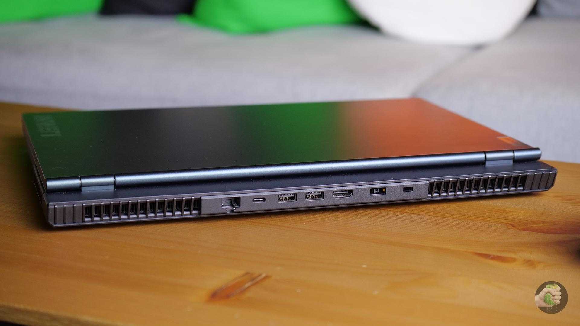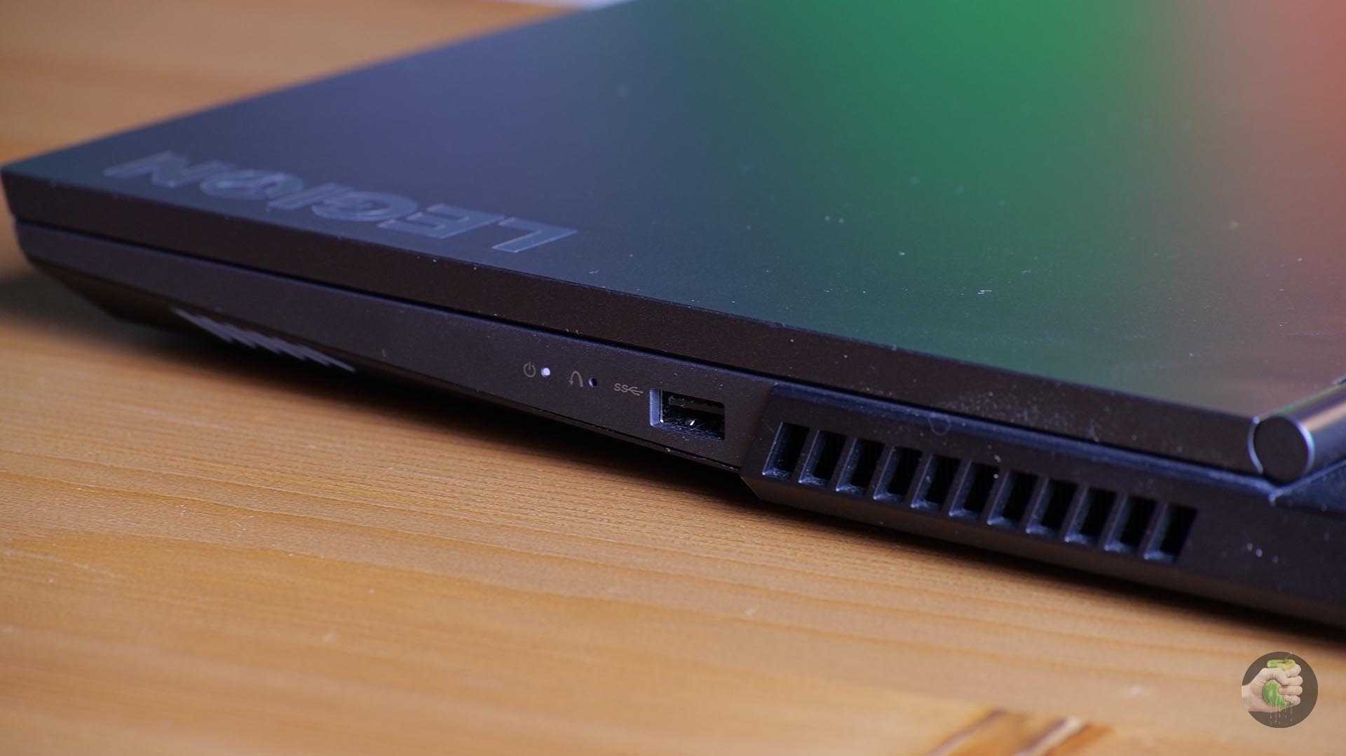 Намётанный глаз сразу заметит функциональное решение, которое оценят и геймеры, и те пользователи, кто привык подключать ноутбук к монитору: на заднюю панель корпуса выведены практически все разъёмы — Ethernet-порт, HDMI, питание, USB Type-C и два разъёма USB Type-A 3.1. Если вы не любите, когда на вашем рабочем столе много проводов, то такая концепция придётся вам явно по душе. Дополнительные очки за эргономику Lenovo Legion 5 получит от поклонников кабель-менеджмента, ведь с таким расположением разъёмов гораздо легче собрать провода, перевязать их силиконовыми стяжками, а то и вовсе пустить в отдельный короб через отверстие в столе. П — перфекционизм. На левой и правой боковых панелях лэптопа — по одному из оставшихся двух USB-портов, их удобно использовать для мелкой периферии: флешек, переносных SSD, адаптеров для беспроводных устройств ввода и так далее. Слева также расположился комбинированный разъём для наушников.