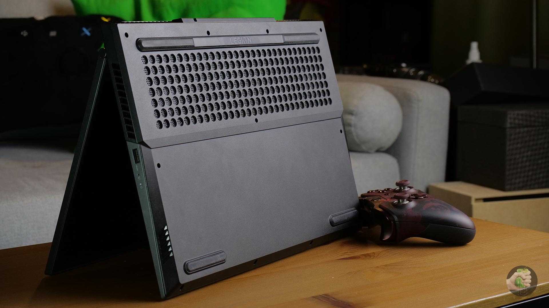 Что интересно, во всех ноутбуках линейки используется термодатчик, фиксирующий температуру на 6 точках на корпусе в районе клавиатурного блока и превентивно запускающий вентиляторы, дабы не допустить перегрева и роста шума. Но на этом аппаратные особенности системы охлаждения не заканчиваются. На задней панели под разъёмами расположены вертикальные отверстия решётки системы охлаждения, в предшественнике они располагались горизонтально, и как раз вертикальная ориентация более продуктивна по части отвода тепла. Наконец, на соприкасающейся со столом поверхности Legion 5 расположено множество круглых вентиляционных отверстий, они тоже способствуют отводу тёплого воздуха из корпуса.