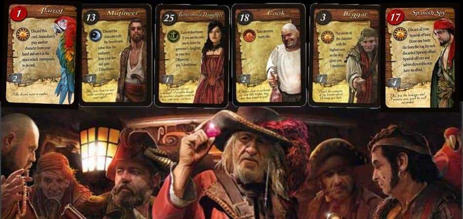 Большая часть игры сосредоточена вокруг этих карт. Каждый из них представляет отдельного члена экипажа с указанием их соответствующего звания (от губернатора Испании до Попугая — это определяет порядок, в котором люди выбирают добычу), особых способностей и влияния (используется для определения равенства в ранге).