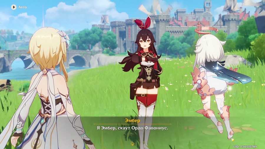 Хоть Эмбер и относится к новым путникам с осторожностью, но предложила их проводить до города Мондштадт. Теперь Эмбер оказывается в вашем отряде и вам поручают победить при помощи её способностей Анемо слайма, так как герой обладает способностью дальней атаки, со слаймом мы разбираемся при помощи стрельбы из луки нажав на клавишу R
