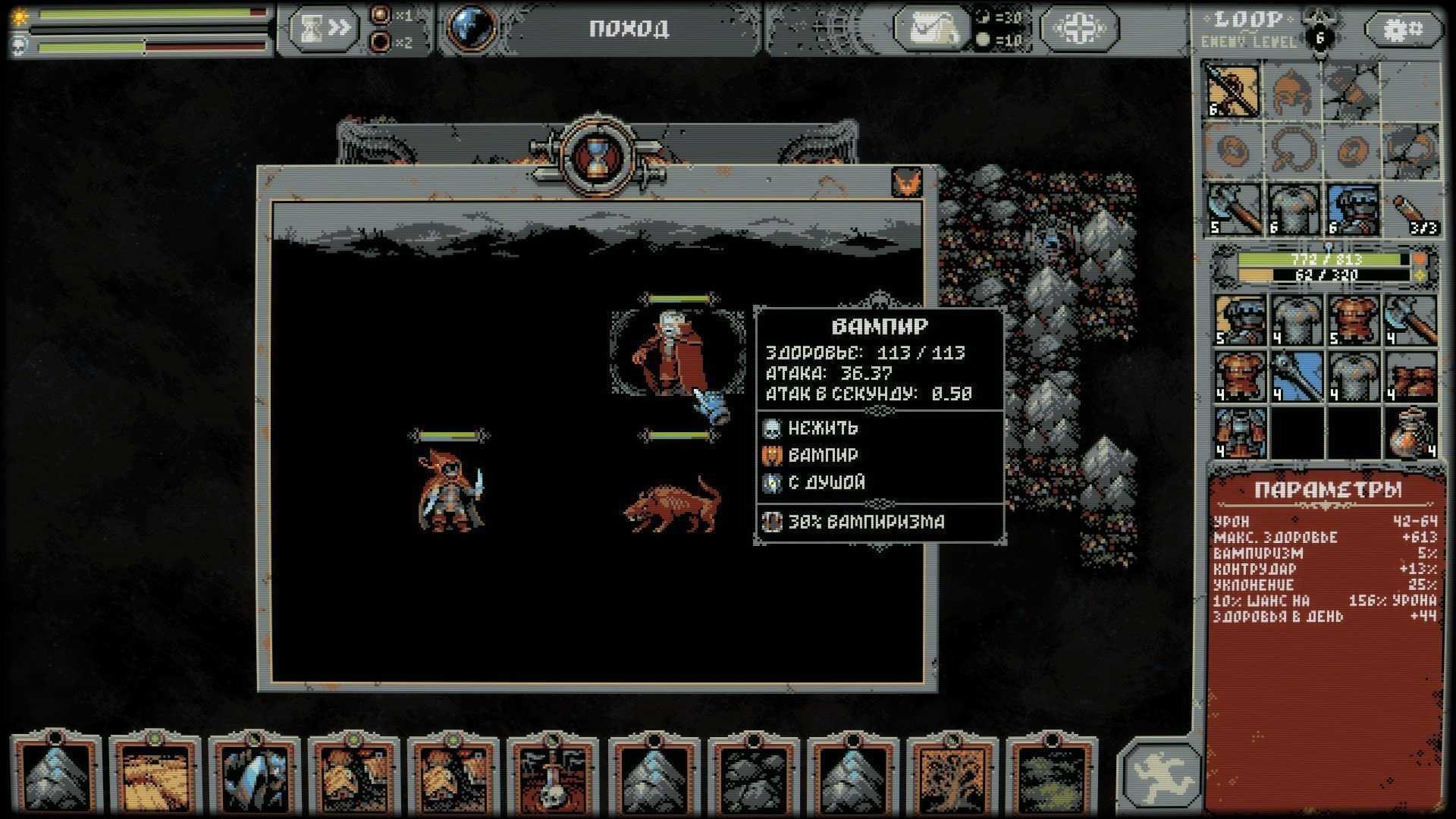 В Loop Hero (2021) игрок может не только восстанавливать силы за чужой счёт, но и ставить на карте замки вампиров, чтобы затем выбить с них дополнительный лут. Ну и кто, спрашивается, тут настоящий злодей?