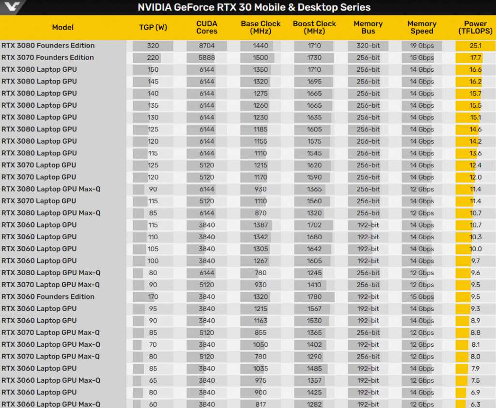 Перед разработчиками стоит основная задача – поставить в ноутбук мощный (а значит, горячий) видеочип, сохранив при этом приемлемые температуры внутри корпуса. Раньше для этого производители могли отдельно ограничивать потребление энергии мобильной видеокарты, и можно было понять, какой её вариант установлен в конкретной модели: Max-Q, то есть максимально тихая с заниженными частотами и энергопотреблением (производительность при этом могла падать до 20-30%), или Max-P, то есть с максимальными производительностью и потреблением. Сейчас производители уходят от этой технологии и учитывают суммарный теплопакет процессора и видеокарты, динамически перераспределяя мощность между ними в зависимости от текущей задачи. Таким образом, чтобы понять наверняка производительность конкретной модели, лучше всего посмотреть её тесты в различных бенчмарках и приложениях и сравнить показатели. И на практике может вполне сложиться ситуация, при которой ноутбук с видеокартой прошлого поколения GeForce RTX 2070 Super может оказаться равным или даже быстрее более дорогих моделей с топовыми новыми чипами RTX 3070/3080.