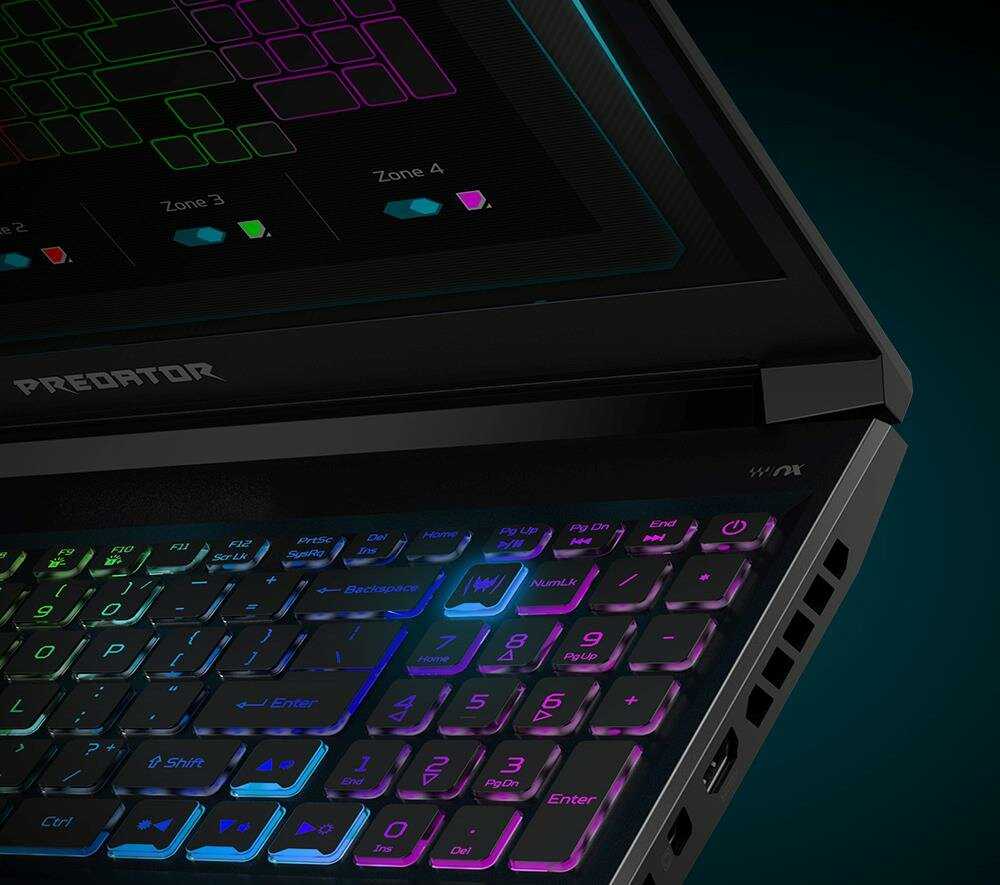 Acer Predator Helios 300 оснащен полноразмерной островной клавиатурой. Это означает, что он также имеет отдельный цифровой блок. WSAD, направление и кнопка, которая вызывает программу Predator Sense, имеют напыление (голубое по умолчанию или другое в зависимости от настроек программы), что отличает их от других клавиш. Направляющие клавиши не были специально отделены от других, но у меня не было проблем с их использованием. То есть, не было ситуаций, когда я случайно нажимал на другие клавиши.