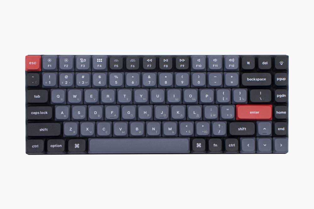 В продаже есть три версии Air75: c синими, коричневыми и красными механизмами-переключателями под каждой кнопкой. Синие при каждом нажатии издают громкий щелчок наподобие печатной машинки. Коричневые тихие, но где-то в середине нажатия чувствуется бугорок тактильного отклика. Красные нравятся мне больше всего: нажатие легкое, тихое и равномерное по всей длине, без спецэффектов.