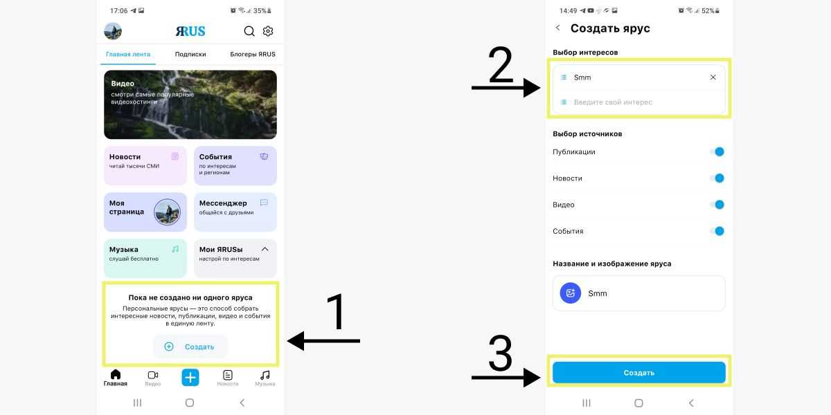 Настройте свой ярус по интересам: нажмите «Создать» внизу под вкладками «Музыка» и «Мои ЯRUSы» и в меню создания яруса впишите тему, которую чаще всего хотели бы видеть в ленте. Настройте источники, из которых вам будут транслироваться новости, придумайте название и загрузите изображение для нового яруса из галереи. Затем нажмите «Создать».