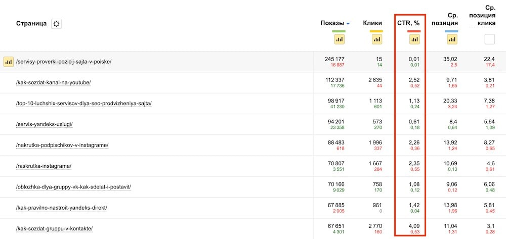 кликабельность (CTR) — отношение количества кликов к количеству показов, выраженное в процентах. Чем выше показатель, тем чаще пользователи переходят на страницу. CTR можно проанализировать через сервисы Google Search Console («Результаты поиска», «+Новый», «Страница»), Яндекс.Вебмастер («Поисковые запросы» — «Статистика страниц»);