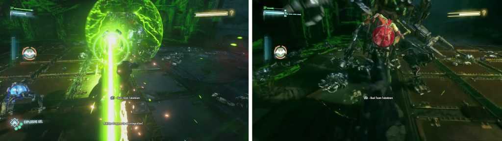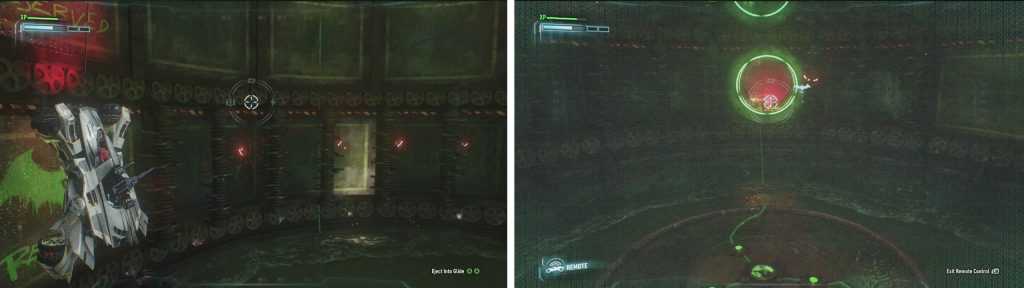 В этой области поверните за угол и активируйте нажимную пластину, чтобы в последний раз понизить уровень воды. Перед выходом переключитесь на дистанционное управление бэтмобилем и используйте его, чтобы стрелять в сторожевые башни, которые появились в коридоре позади вас.