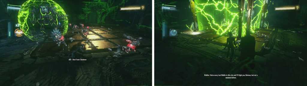 После завершения пазла, появится Риддлер в броне и со своими гуманоидами. Сражаться с ним напрямую нет смысла – просто выводите из строя его гуманоидов и избегайте зеленого лазера.