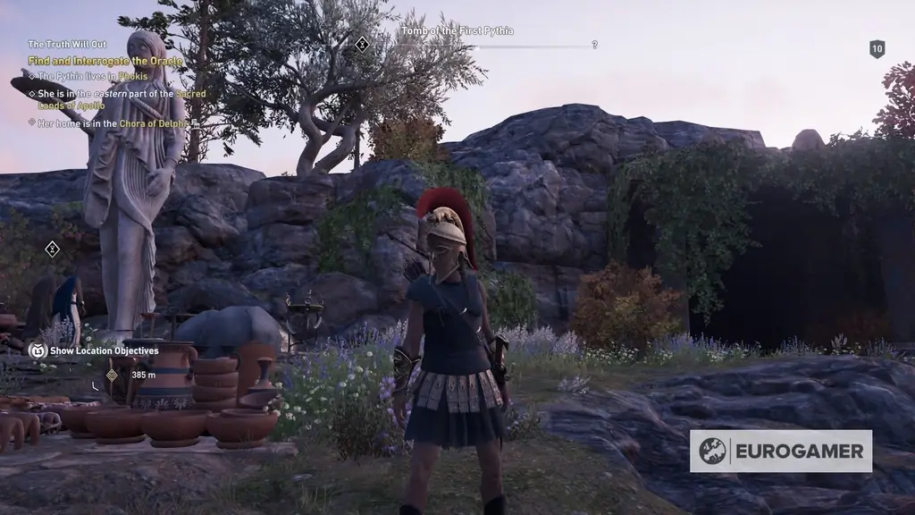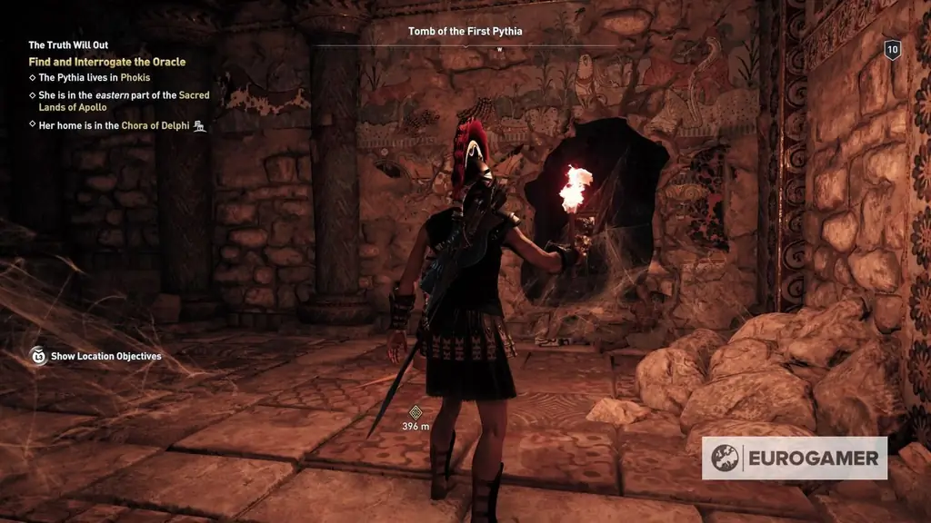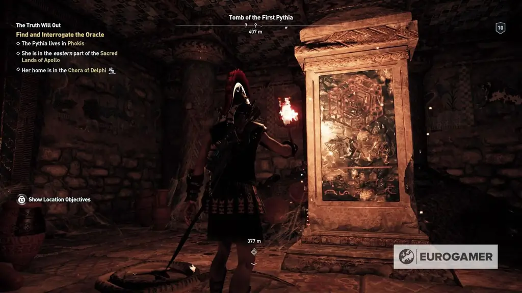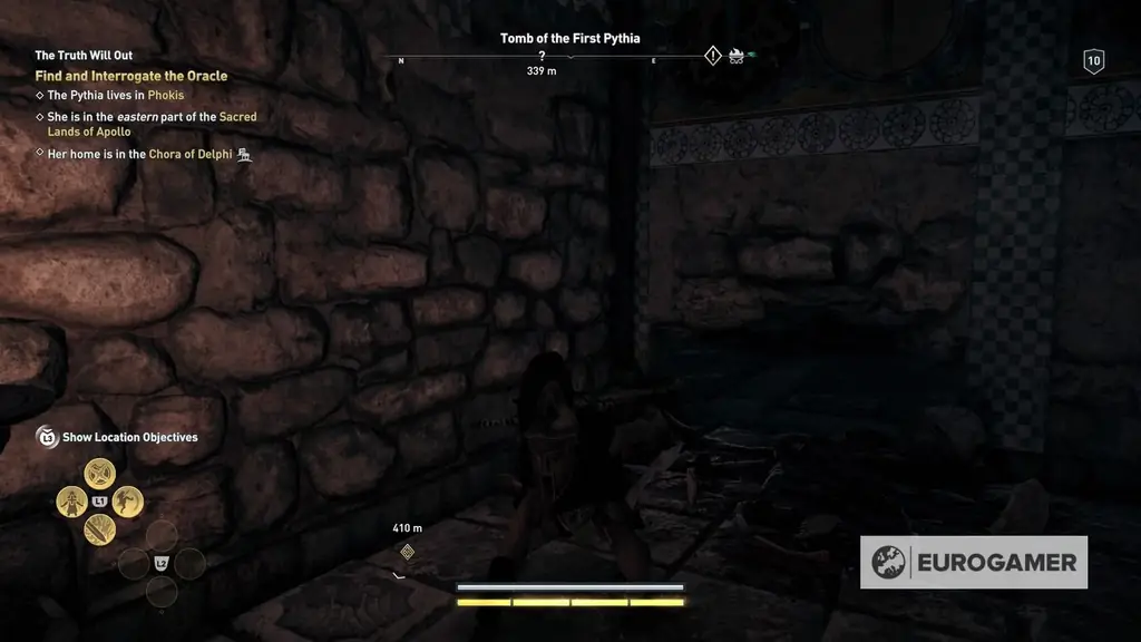 Он расположен к северо-востоку от Святилища Дельф. Вход находится рядом со статуей в окружении паломников. Пройдите внутрь, и вы найдете зажженную жаровню с двумя тупиками с каждой стороны. Следуйте по пути в другую комнату и найдите там монеты.