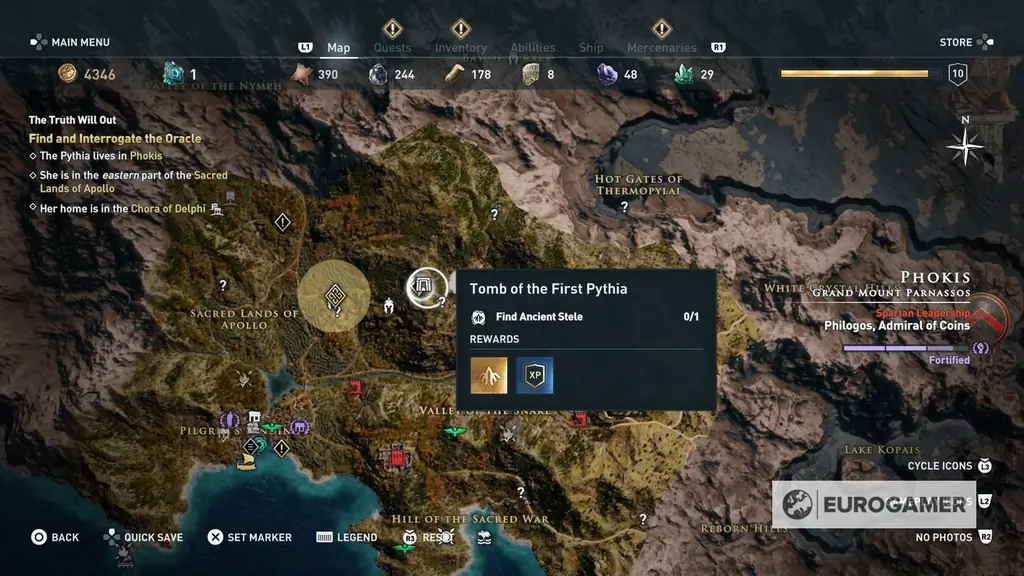 Отправляйтесь в храм Апполона на Фокиде. Перед тем, как зайти поговорите с Варнавой и Геродотом, в дальнейшем вашим новым спутником. Отреагируйте как считаете нужным на такое знакомство, а затем отправляйтесь к Пифии. Чтобы вы её не спросили, на вопрос она не ответит. Но зато она повторит ваше прошлое и назовёт имя врага — Культ Космоса. А затем стражники попросят вас выйти.