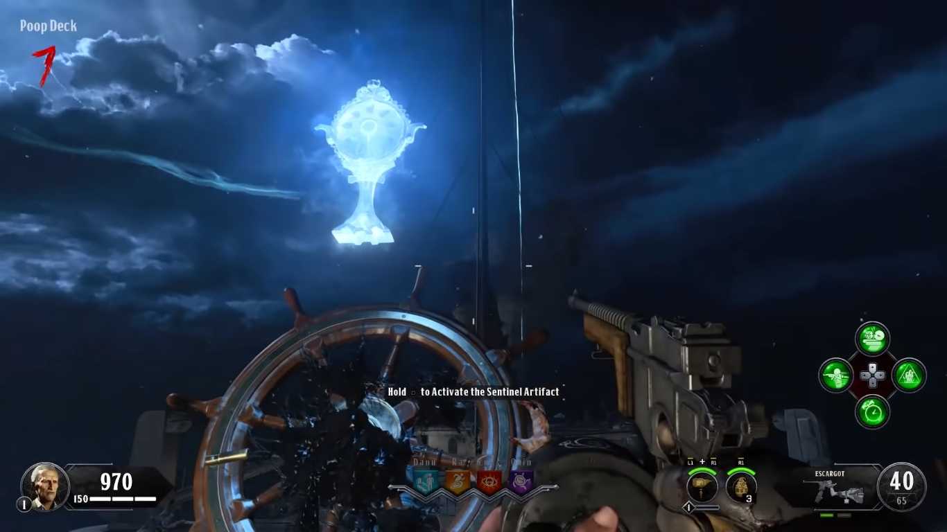 The final place you’ll be teleported to is the Poop Deck, and for this phase you need someone with the Kraken. Keep shooting the eye with the Hellion Salvo at first, then, eventually, it will go to the very back of the Poop Deck and start a charging animation. In order to get it to stop charging, shoot it with the Kraken. The Ice upgraded version is more effective than the other elemental types for this, but it’s still doable without. If you fail to stop it charging, the Eye of Odin’s resulting attack will down every single player that isn’t using the Dying Wish perk. You need to stop if from unleashing its charge attack three times. Once you’ve done it the third time, the Eye of Odin will be defeated and the final cutscene will commence. Congratulations — you’ve completed the Black Ops 4 Zombies Voyage of Despair easter egg!