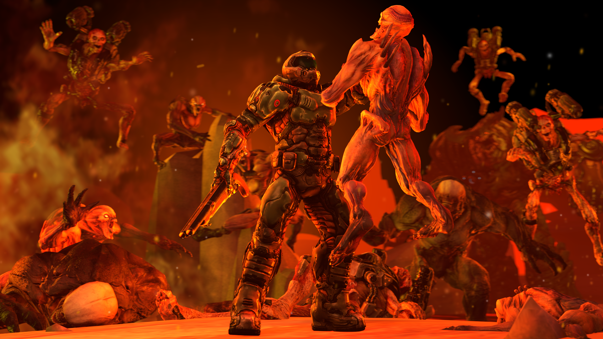 Новый многопользовательский опыт 2 против 1. Полностью вооруженный Убийца DOOM сражается с двумя управляемыми игроками демонами, сражаясь с ним в матче лучших из пяти раундов интенсивного боя от первого лица.