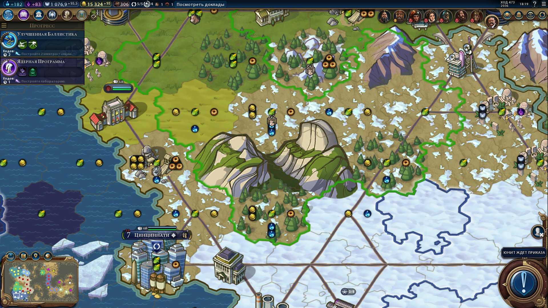 Открываем разные чудеса света – Эрмитаж, Большой Театр, Биг Бен, Оксфорд, Рурская долина. Вот тут сложно. Необходимо сильно постараться их построить. Халявные ячейки культуры и доп.золото (только у Биг Бена), доп. наука (только у Оксфорда), доп. производство (только у Рурской долины). Строим их там, где у нас преимущественное направление – производство, наука и т.д. (опять действует метод «город-его направление» – если вокруг города полно рудников – строим там Рурскую долину и т.п.
