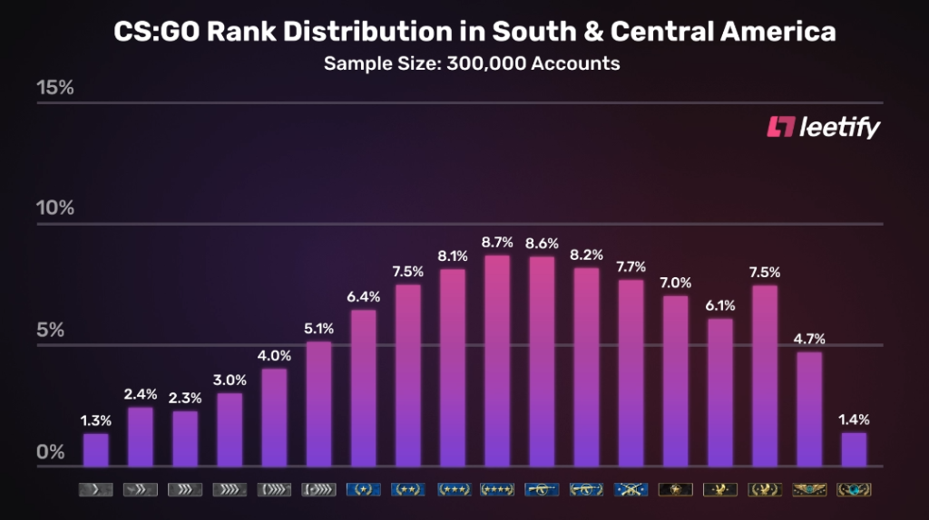 В Океании и Северной Америке большинство геймеров имеют низкие звания. В Азии самым популярным оказался ранг Gold Nova 3. В Европе и Южной Америке это звание также встречается чаще всего, однако при этом в обоих регионах больше пользователей, имеющих ранг Global Elite.