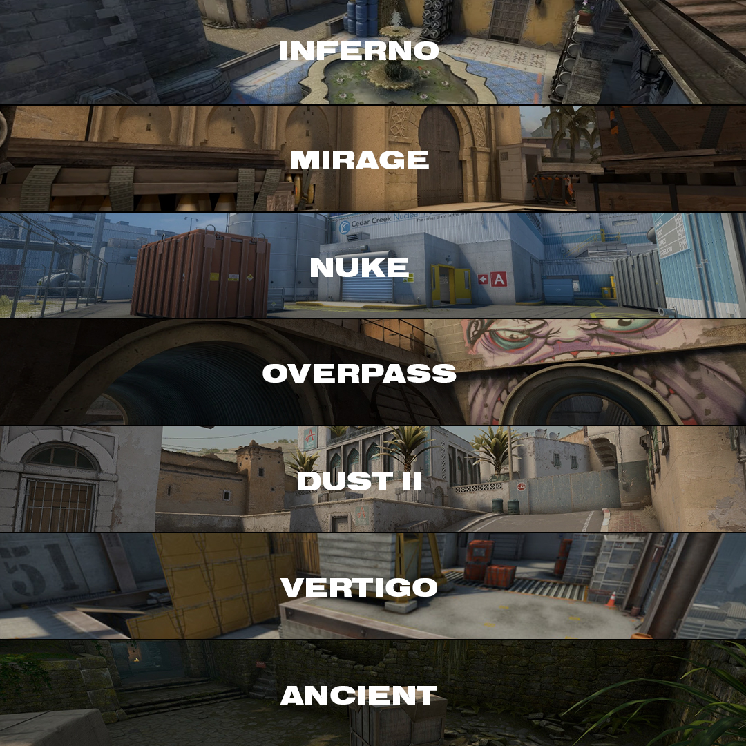Например, разработчик удаляет карту из списка для того, чтобы переработать ее, изменить и вернуть вновь. Так было уже не раз. Например, с de_mirage, de_nuke и многими другими картами. При этом разработчик старается создавать одинаковый список карт с теми, что используют профессионалы. Это нужно для того, чтобы игроки и профессионалы были примерно на одной волне и имели одинаковые знания об игровом процессе. Главные карты, добавленные в соревновательный режим, выглядят следующим образом:
