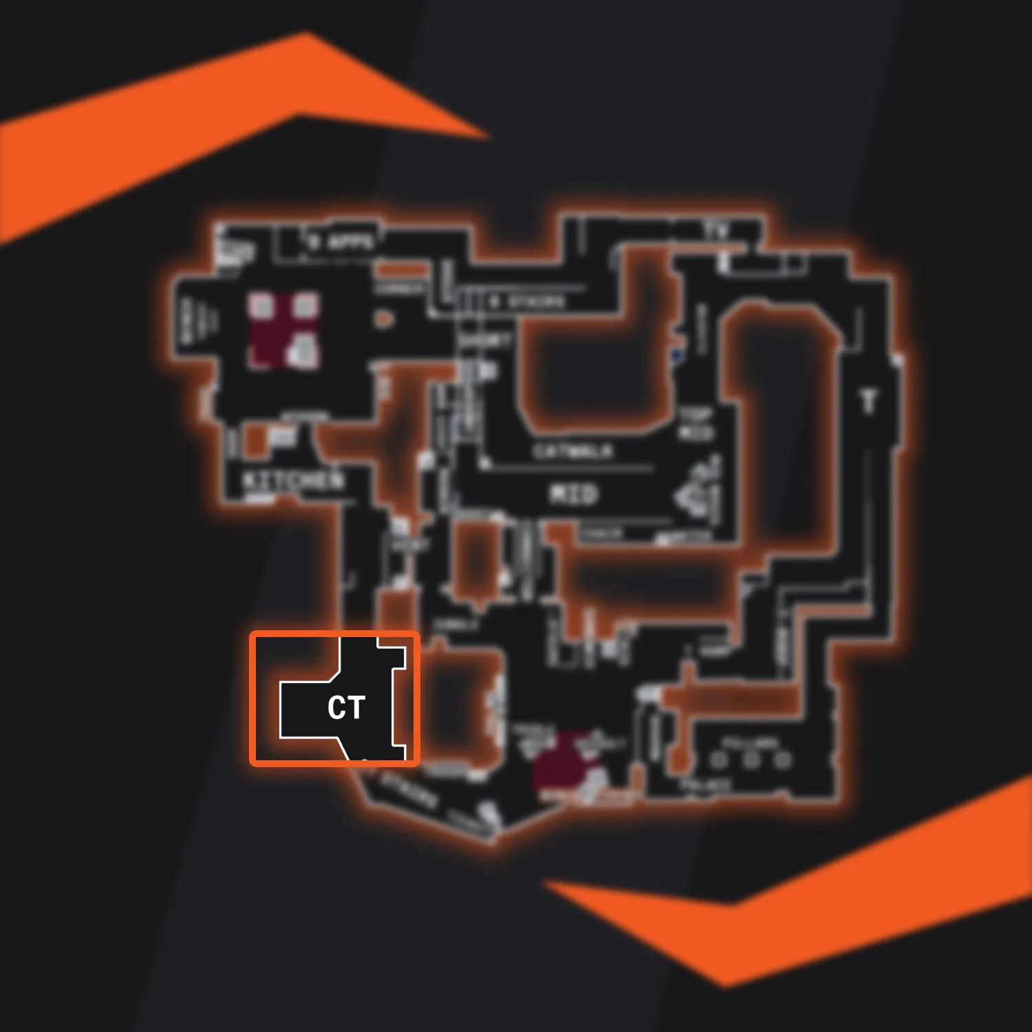 Базируясь в нижней левой части карты, CT Spawn расположен близко к действию. Правый угол сразу ведет к лестнице CT и к точке B. Однако, чтобы добраться до точки B, игрокам нужно добежать до конца левого пути, пройти через небольшой дверной проем и следовать по рынку, чтобы добраться до зоны точки B.