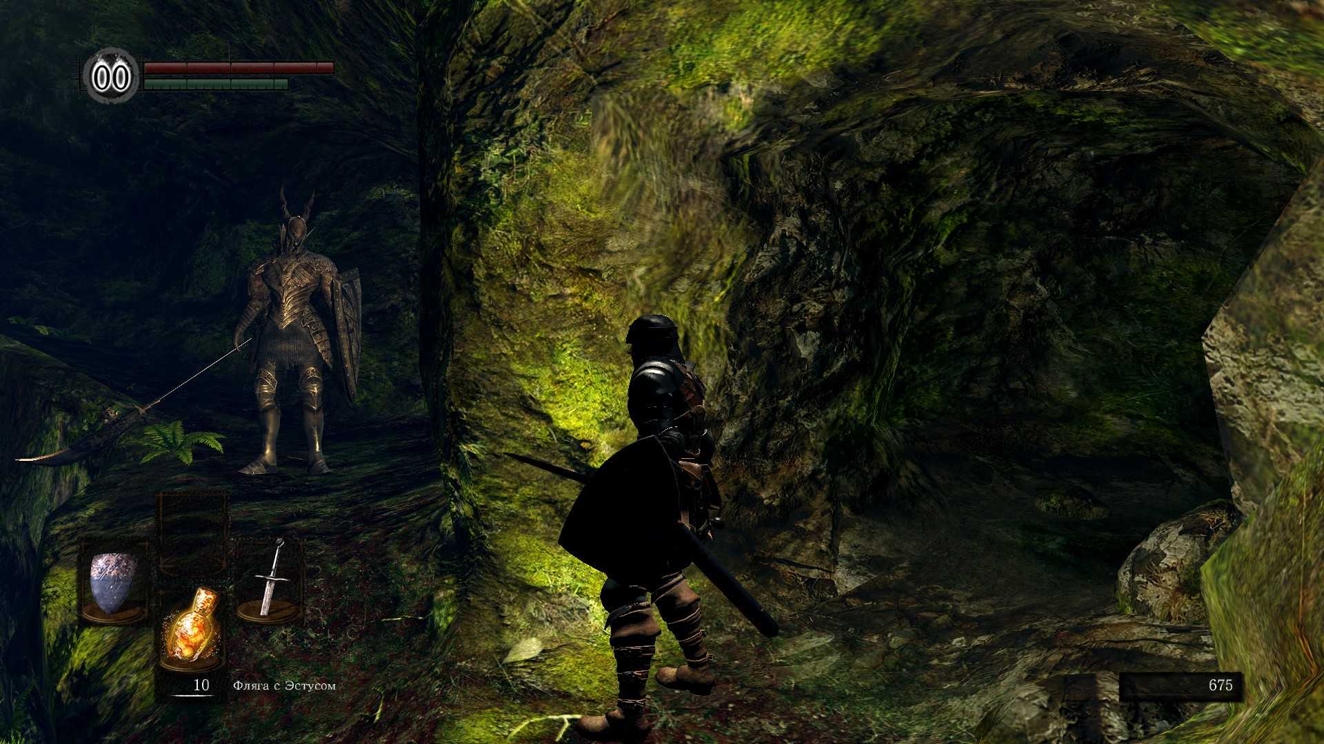 Итак, в конце тоннеля,перед нами первый Черный Рыцарь. С этого экземпляра может выпасть Щит и Алебарда. Черные рыцари одни из немногих противников, которые не возрождаются после смерти, соответственно, если хотите алебарду, а с него не выпала… ну тогда или начинайте игру заново, или терпите аж до Склепа Великанов… но тогда, скорее всего, она вам уже и не понадобится. Тактика боя с ним – кружим, пытаемся обойти сзади, старайтесь обходить со стороны щита, если у вас так же есть щит – все время держите его. Перекатываться не желательно, рядом пропасть. Следим за его атаками, как только сделал серию, мы уже должны быть у него за спиной. И бэкстаб. Пока оружие у вас стартовое, урон будет маленький. Набираемся терпения и повторяем несколько раз. Благо костер рядом. Идеальным вариантом будет подловить его на краю пропасти, тогда после удачного бэкстаба, мы просто спихнем его с края.
