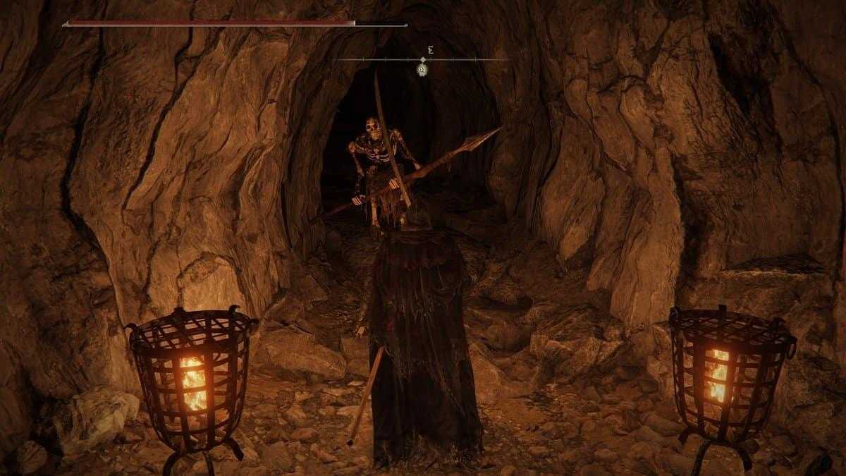 Продолжайте идти вперед, пока не дойдете до места, где есть костер и парочка скелетов. На севере есть скелет, стоящий лицом к стене. Это иллюзорная стена. Ударьте ее, чтобы найти сундук с мечевидных ключом.