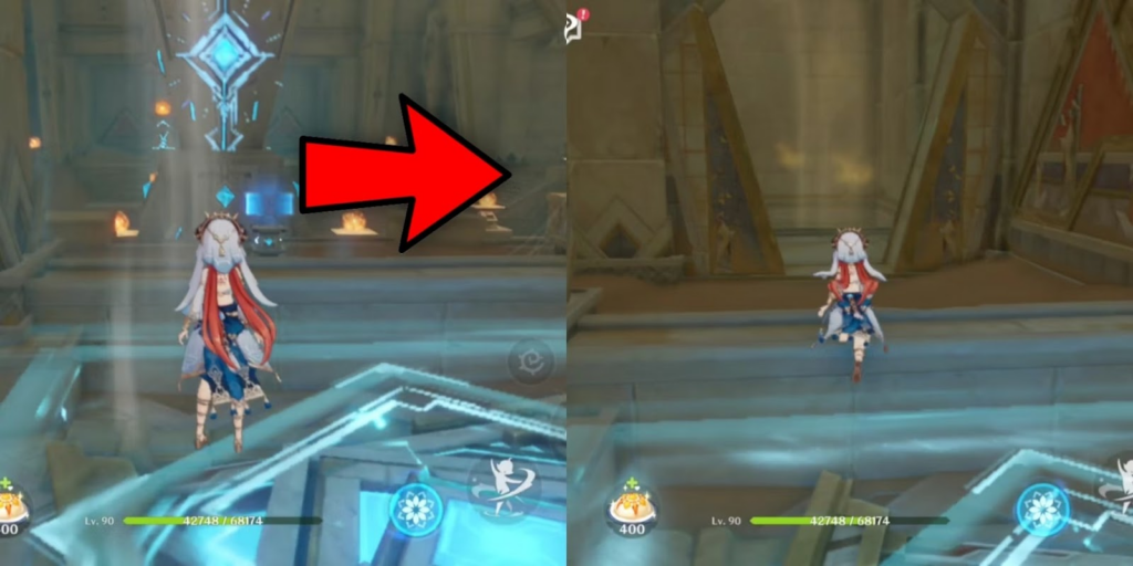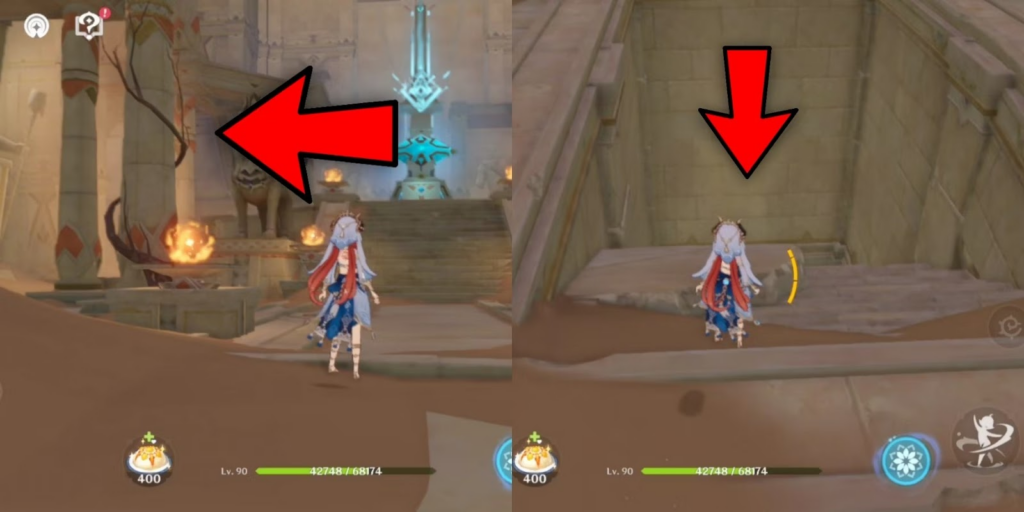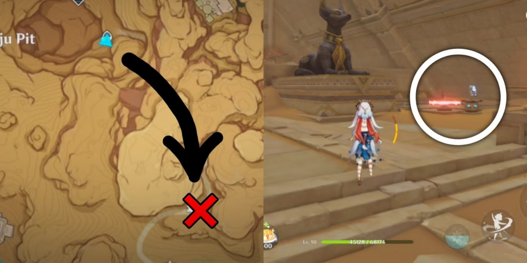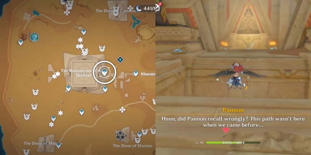 Следующая локация искрящейся детали проста. Просто телепортируйтесь к точке рядом с Гробницей Царя Дешрета и входите в здание, пока Паймон не скажет о новом проходе. Войдите в эту дыру на полу и следуйте к Первозданным конструкциям.