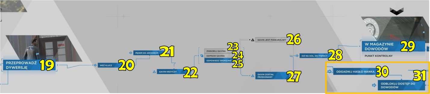Так или иначе, появится Перкинс (12), который взял на себя расследование. Разговаривая с Хэнком, Коннор попытается убедить его, что расследование должно быть продолжено. Коннор должен попасть в архив, чтобы повторно собрать доказательства. Ответ Андерсона зависит от ваших отношений.