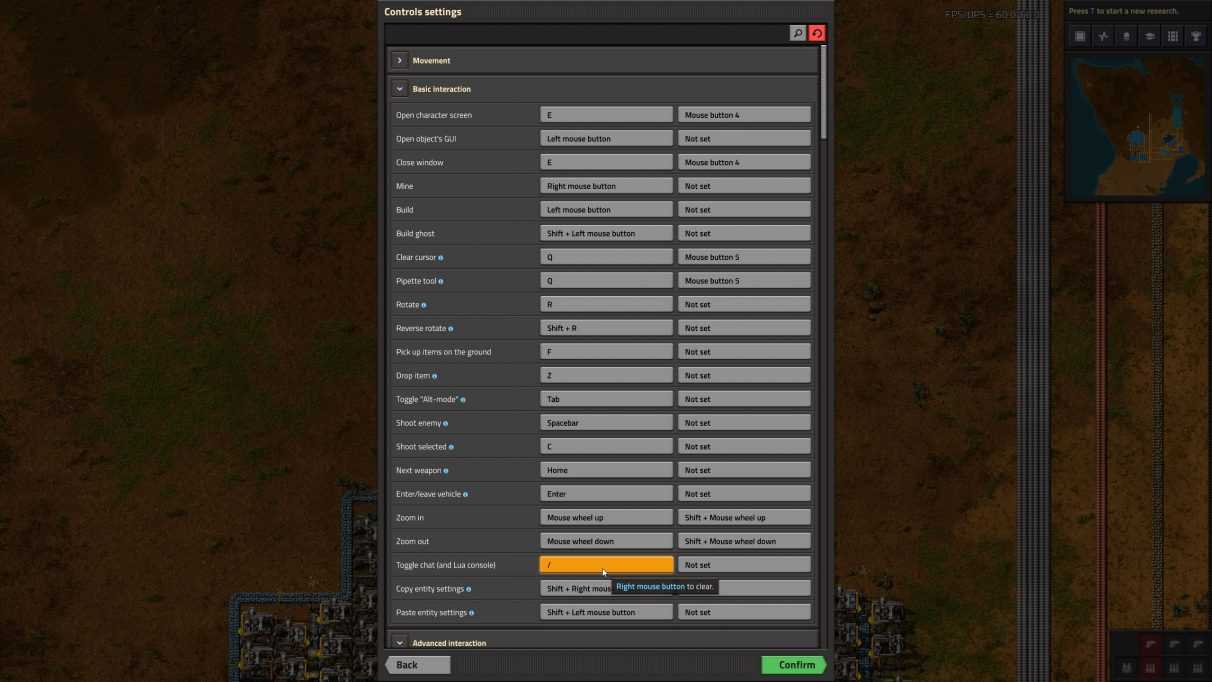 To access Factorio’s console, all you have to do is hit the «/» key while in-world. If this doesn’t work, you can check (or assign) which key to press by opening the menu and navigating to Settings->Controls->Basic Interaction->Toggle chat (and Lua console).