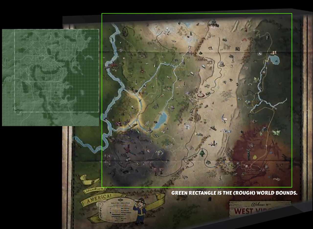 Что касается непосредственно Западной Вирджинии, то карта Fallout 76 в четыре раза больше, чем Fallout 4. Тодд Говард на презентации сообщил, что она разделена на шесть уникальных регионов, каждый из которых основан на реальной культуре, представляет реальные локации и даже легенды.