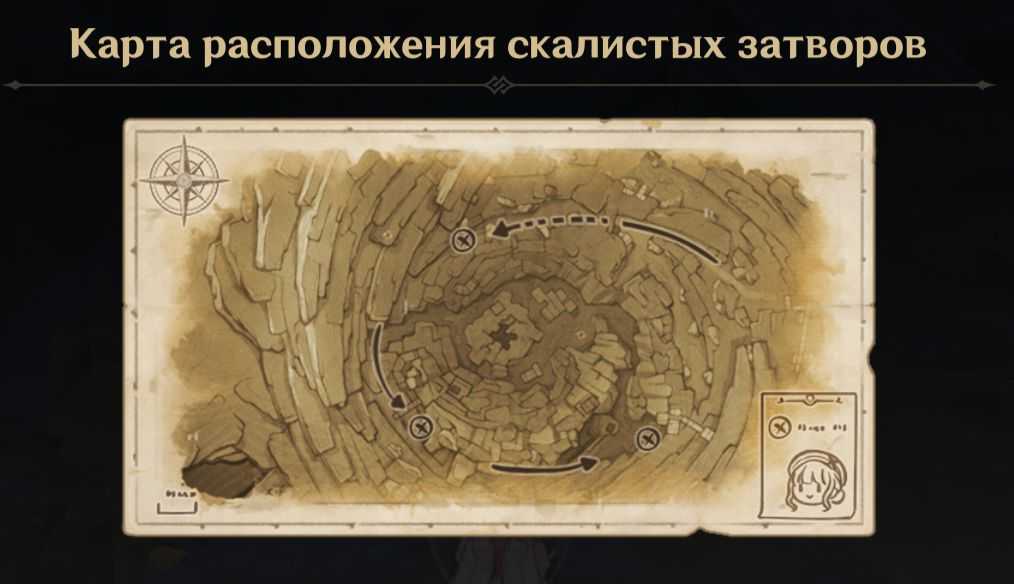 Ниже — карта скалистых затворов, которую игроку дают по квесту. Здесь всего три точки — нет нулевого и последнего затвора. Стрелки указывают на объекты по возрастанию сложности квеста. На самом деле нет разницы, в каком порядке их разрушать.