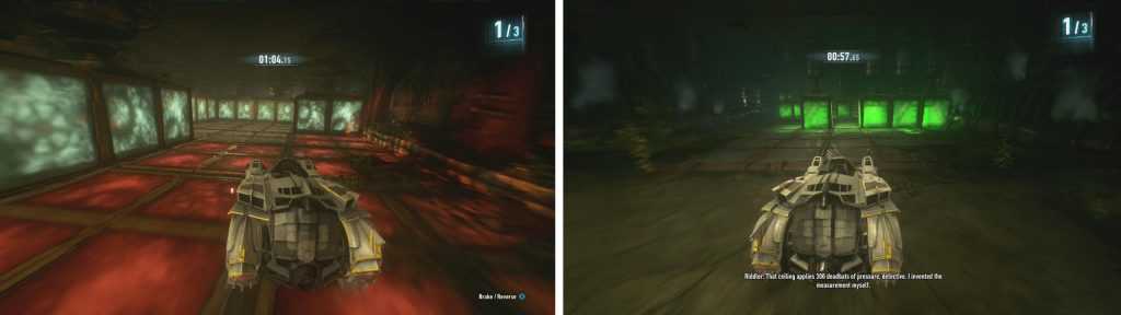 Используйте твердую почву при переходе на дробильные полы (слева). Используйте зеленый свет, чтобы определить, где находится ключ, как Женщина-кошка (справа).