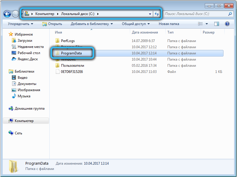 Другой способ, действующий во всех версиях Windows — вписать строку «%ProgramData%» в поле для ввода адреса и нажать клавишу «Enter».