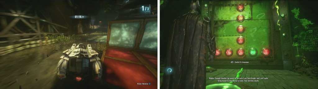 По мере прохождения трассы вам нужно будет использовать код доступа Загадочника, который мы получили ранее, чтобы добавлять/удалять/перемещать препятствия, пандусы и платформы на гоночной трассе и за ее пределами. На этом треке есть большие участки пола, покрытые цветными блоками, которыми можно манипулировать, однако в 90% случаев активация кода доступа Загадочника на цветных плитках раздавит Бэтмобиль и отправит вас обратно в предыдущую комнату. Таким образом, вы захотите использовать промежутки обычной земли между наборами потенциальных блоков дробления, чтобы использовать код доступа Загадочника.